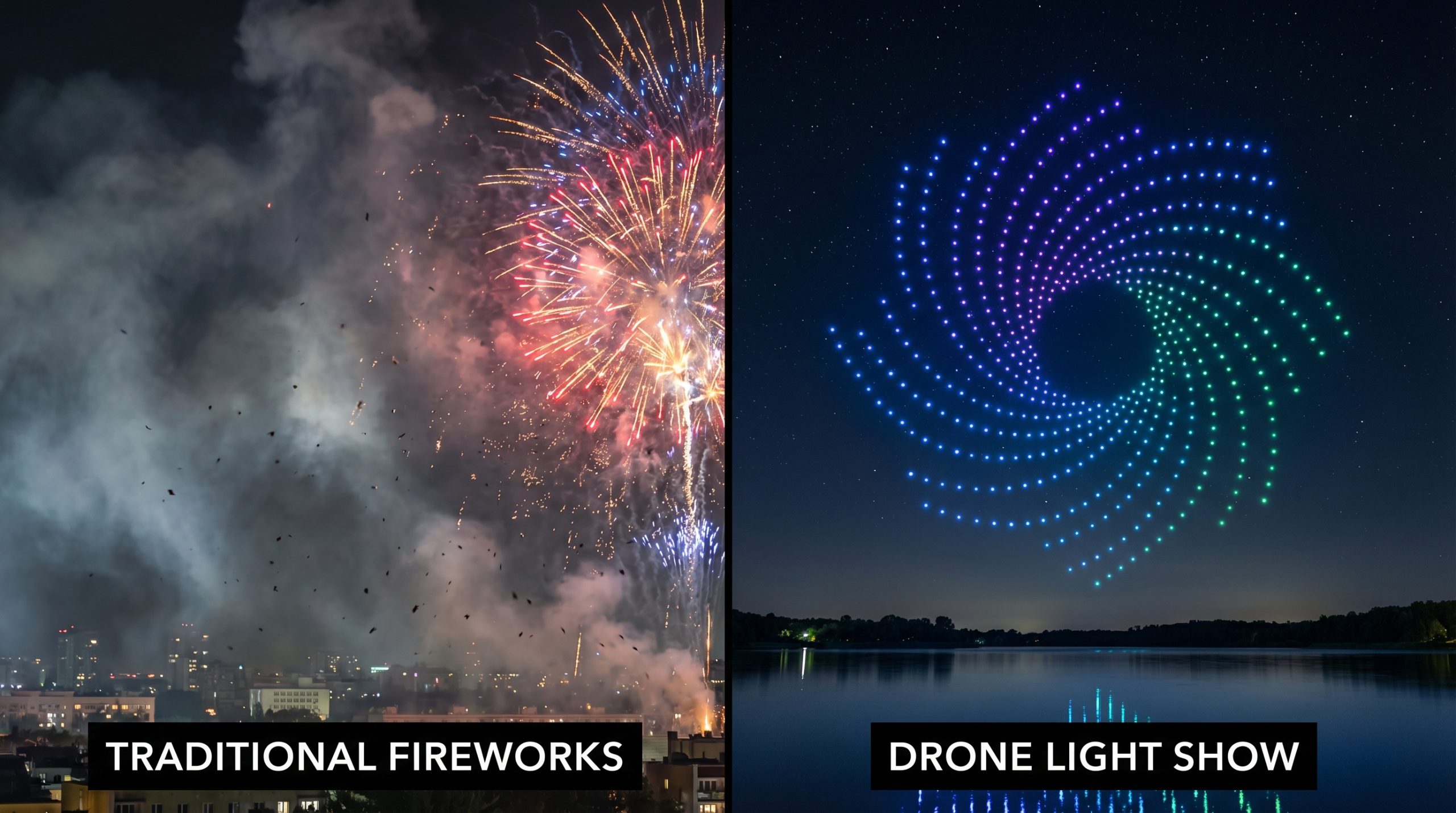В тази статия ще направим честно сравнение между дрон шоу и фойерверки по всички важни критерии: екология, безопасност, визуален ефект, персонализация и разбира се — цена.